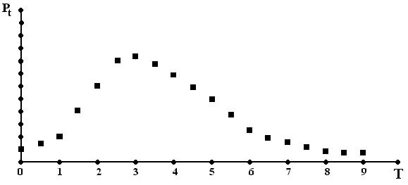 The combination of the two processes - (1) increasingly retarded acquisition of meanings and (2) accumulation, with time, of lost meanings should result in the characteristic asymmetric bell-shaped pattern of polysemy size development for a typical word during its life time. (See Fig. 1).